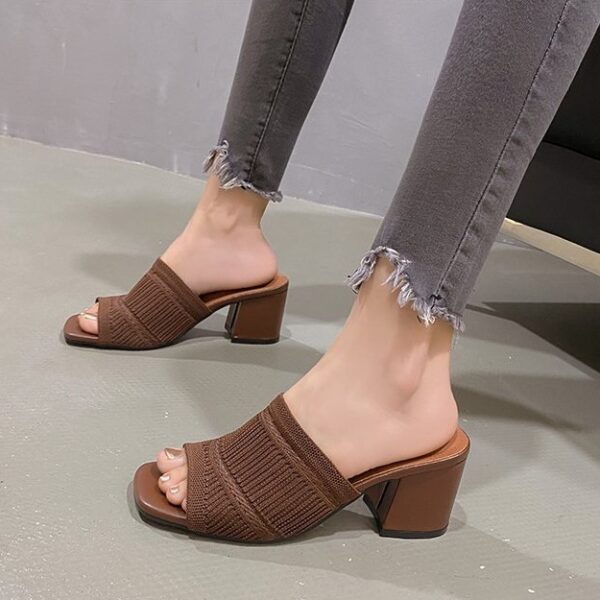 Rhinestone square buckle closed-toe slippers for women, summer outerwear, suede pointed toe chunky heel high heels