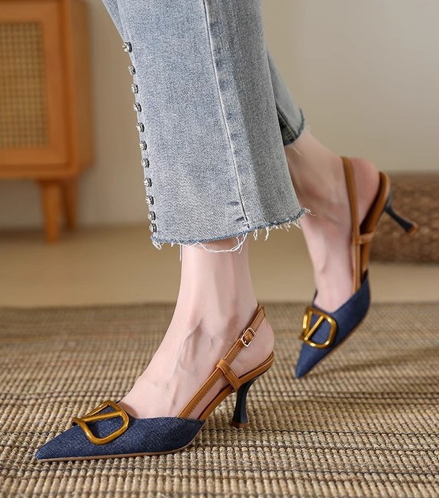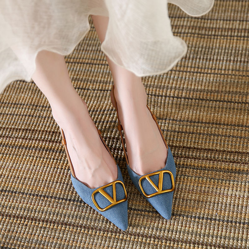Light Luxury Style Baotou Stiletto Sandals for Women 2026 Summer New Style French Socialite Shallow Mouth Pointed Toe Denim High Heels