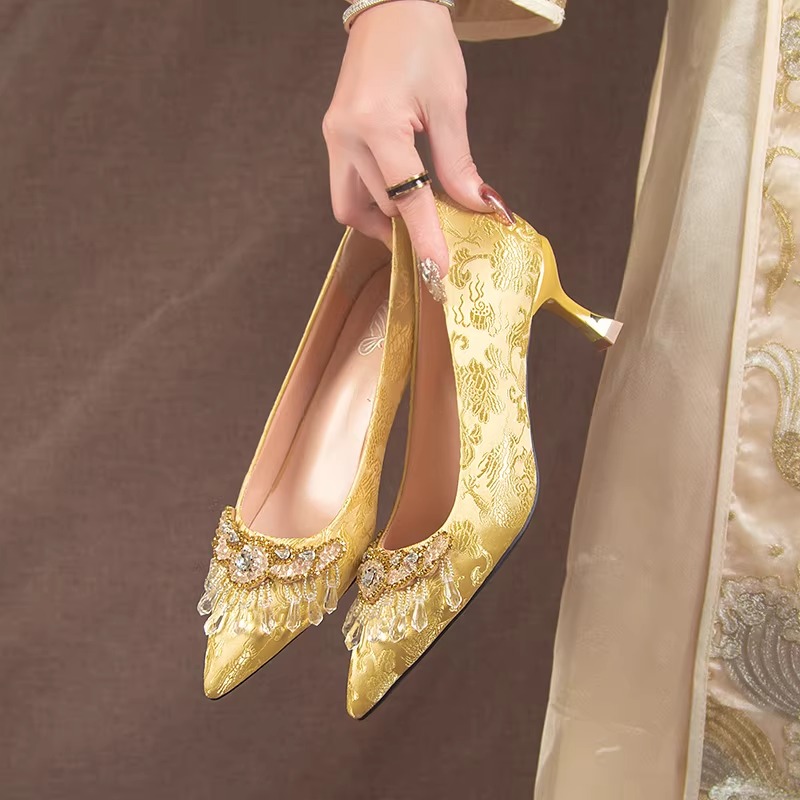 New high-heeled shoes with stiletto heels, mid-heels, and small heels, featuring a gold pointed toe, perfect for brides and traditional Chinese weddings.