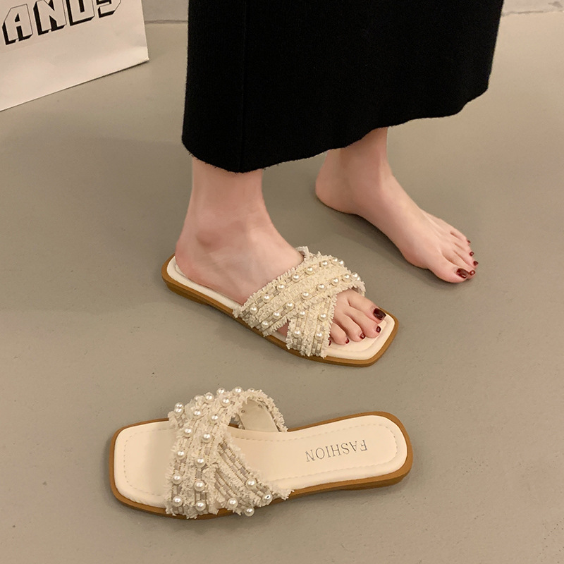 new style pearl fashion flat bottom no tired feet non-slip beach small fragrance style sandals