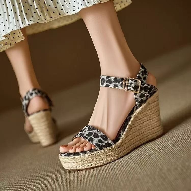 New Summer Hemp Rope Wedge Sandals Fish Mouth Leopard Print Thick Sole High Heel One-Line Sandals Versatile Women’s Shoes