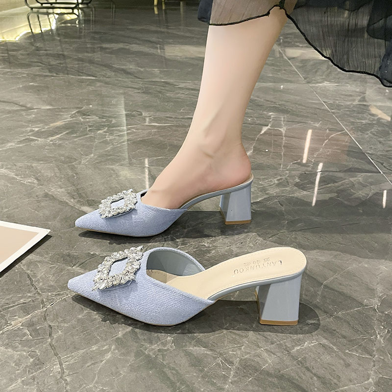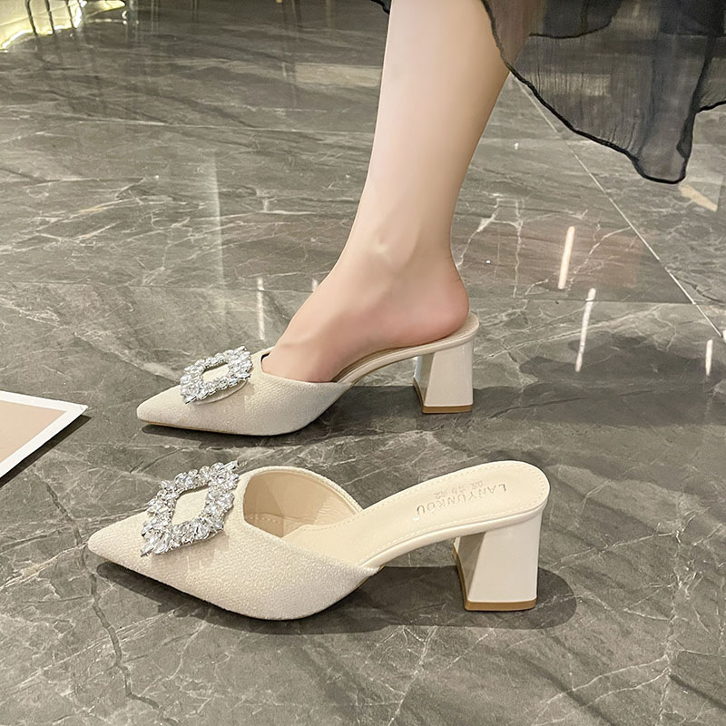 Rhinestone square buckle closed-toe slippers for women, summer outerwear, suede pointed toe chunky heel high heels