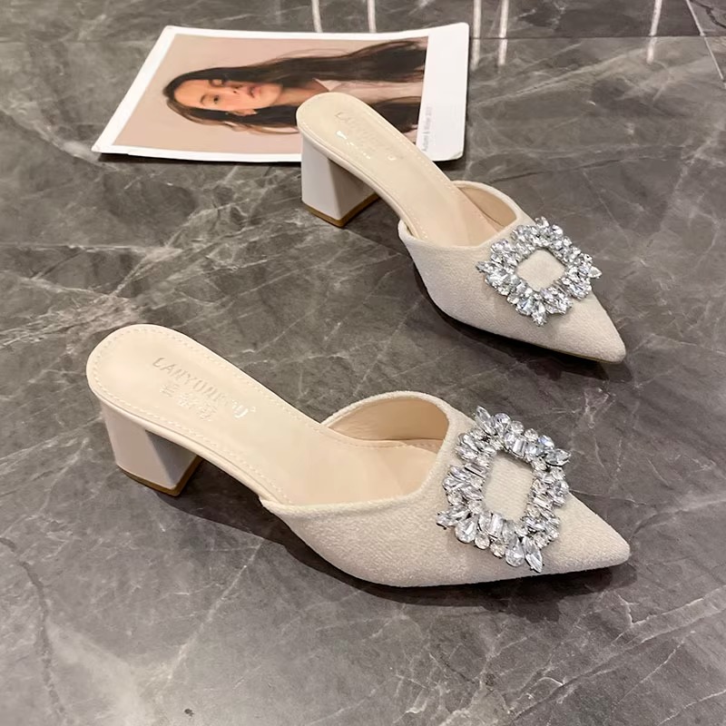 Be the first to review “Rhinestone square buckle closed-toe slippers for women, summer outerwear, suede pointed toe chunky heel high heels” Cancel reply