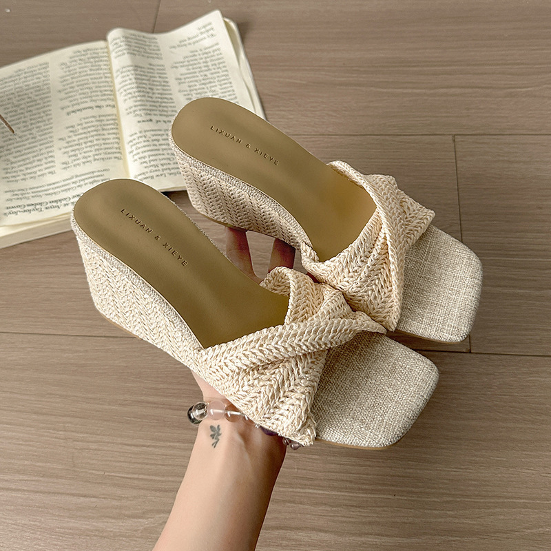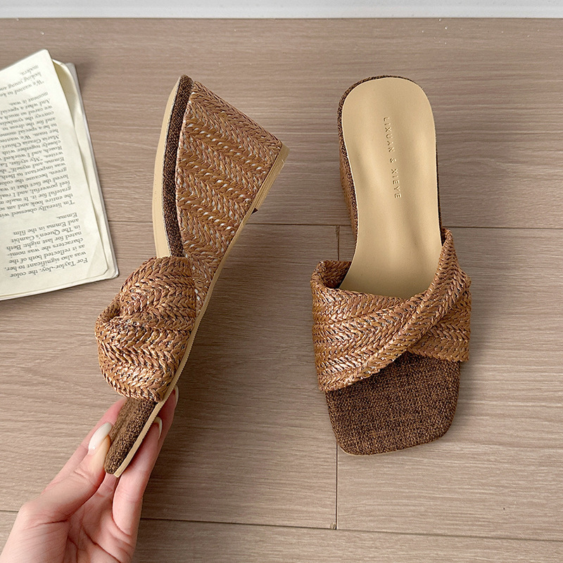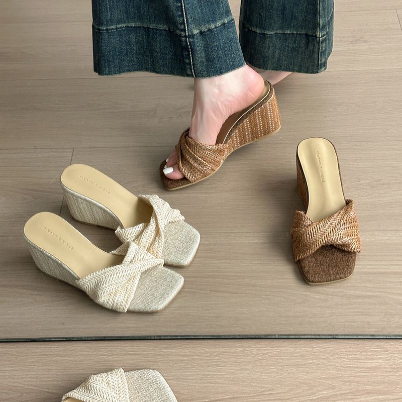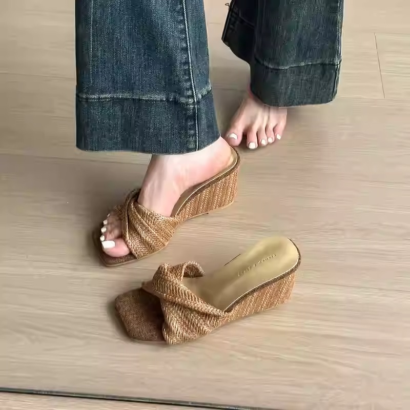 Vacation Style Retro Woven Wedge-Heeled Slippers for Women’s Casual and Versatile Square-Toe Open-Toe Sandals White Brown