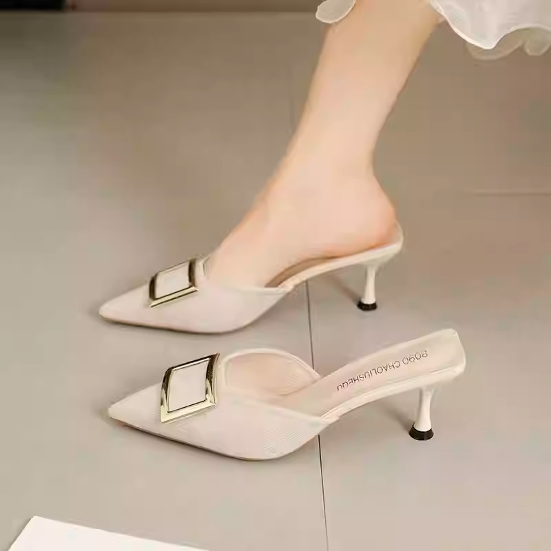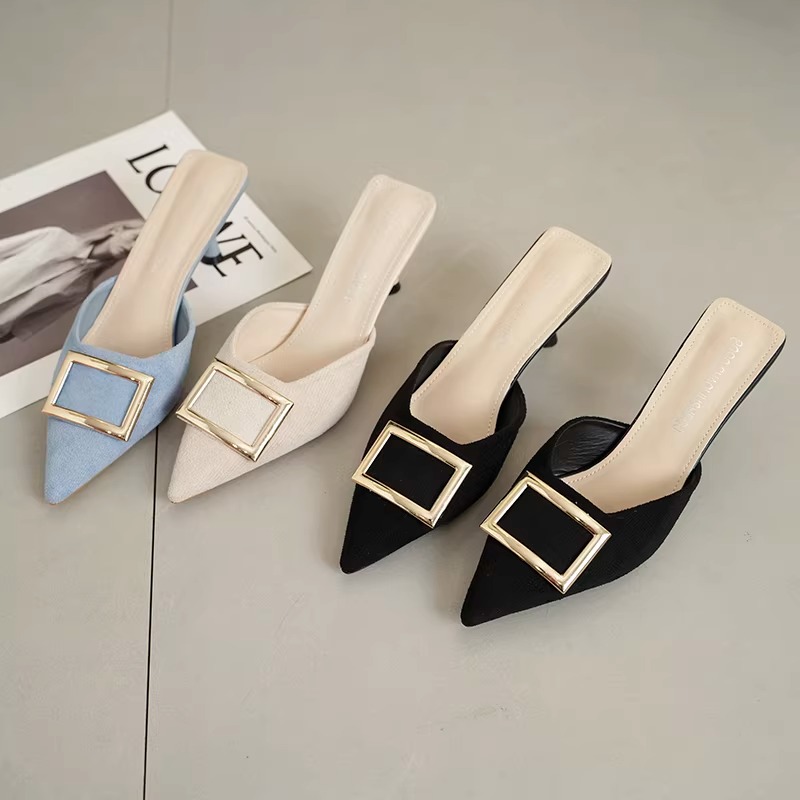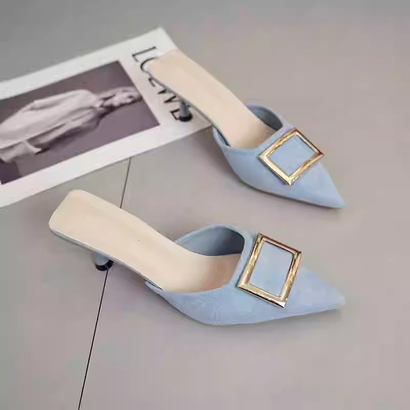 Women’s summer mules with square buckle, suede, pointed toe, mid-heel, stiletto heel, low-cut, low-cut.